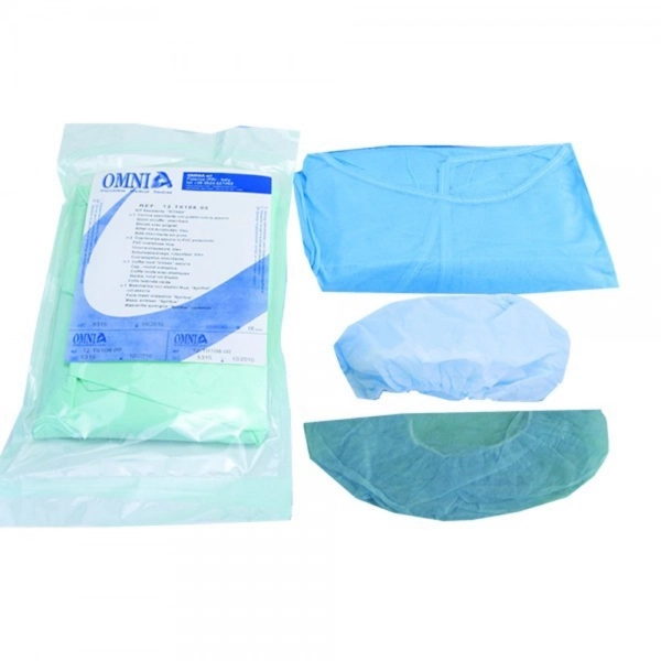 Set Estéril para el paciente. Diseñado para todas las intervenciones de implantología , Parodontología y Maxilofacial. El set se presenta confeccionado con doble embalaje estéril con papel crepado. La bata es sin puños para un mayor confort del paciente. Su práctica etiqueta adhesiva permite una fácil trazabilidad de las intervenciones clínicas. Cada set está compuesto por: 1 Bata hidrorepelente con elásticos en TNT blanco 1 Cofia redonda con elásticos en TNT blanco 2 Cubrezapatos impermeables en PVC azul.